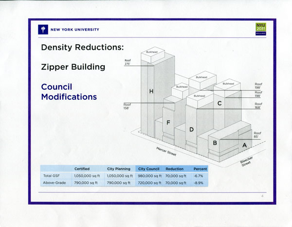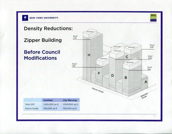 The Zipper building’s design was also “undone” a bit during the City Council negotiations. The above-grade bulk of the block-long building, planned for Mercer St. between Houston and Bleecker Sts., was reduced by about 9 percent. This was done to provide more light and air to residents living in two buildings at or near the northeast corner of Mercer and Bleecker Sts., across the street from the Zipper. Yet, it would be a stretch to say this was the Zipper’s “undoing,” since the project will still contain nearly 1 million square feet of space.