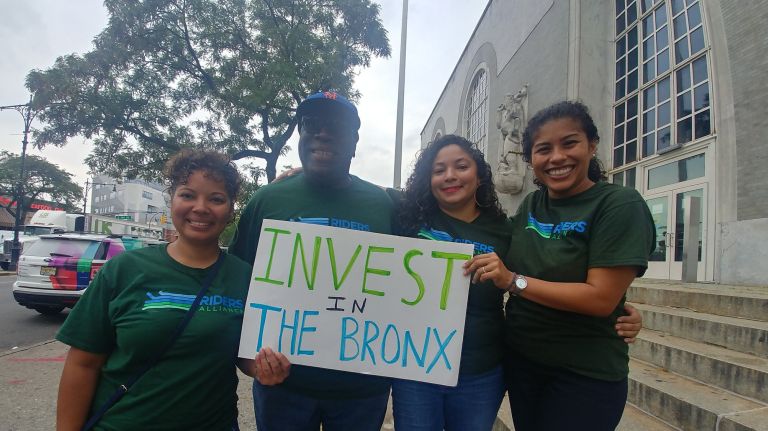 Members of Straphangers Campaign, Riders Alliance and other transit advocacy groups rallied in the Bronx on Tuesday in favor of more funding for Bronx buses.