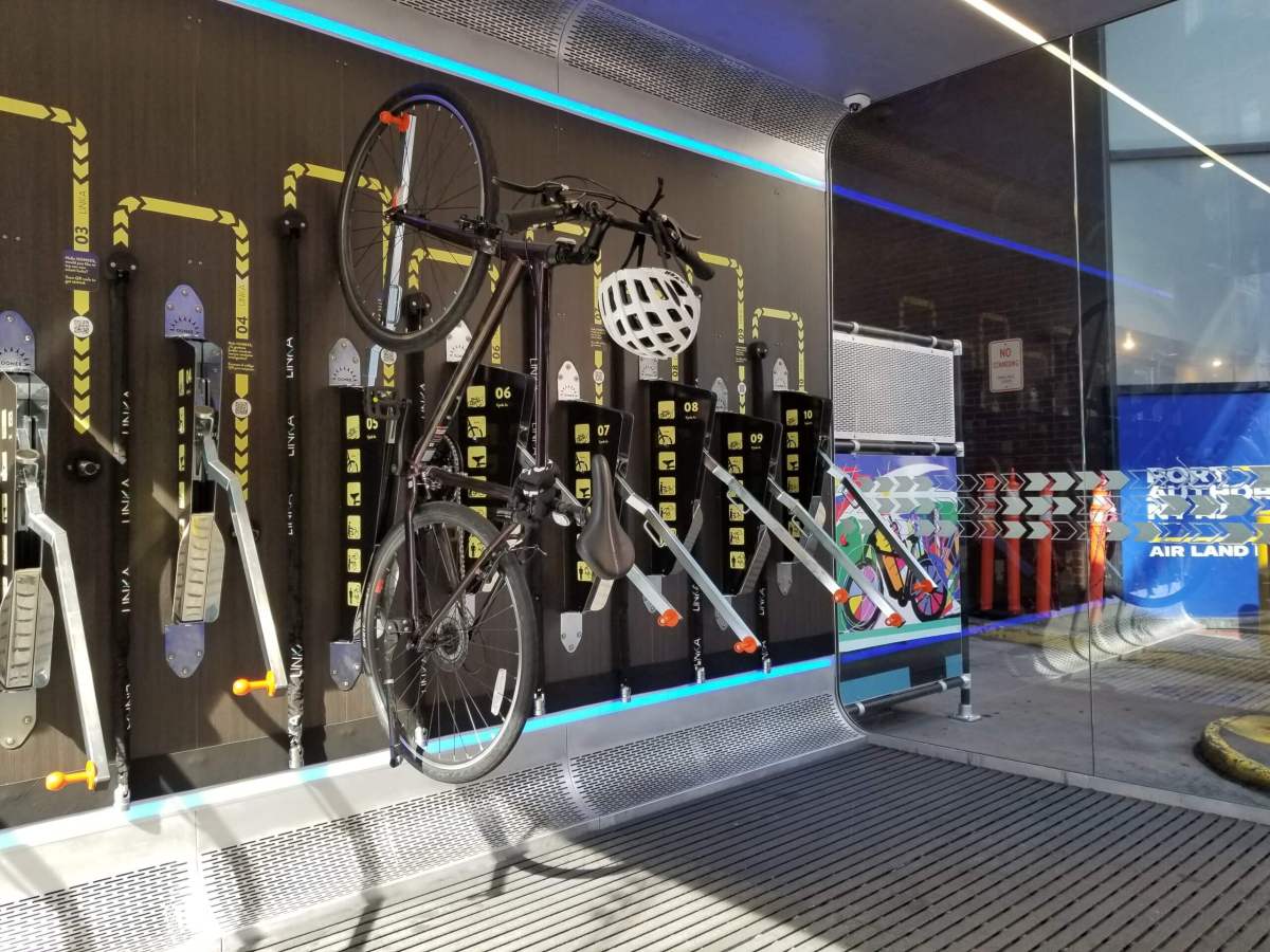 The Oonee “pod” on 42nd Street outside the bus terminal can securely hold 20 bikes, and is completely free to use with a membership, allowing access via a keycard or phone app. Spots on the vertical, “smart-locked” racks are available on a first-come-first-served basis, and can be held for 72 hours before the app sends a notification about inactivity.
