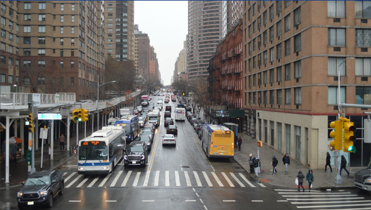 The DOT’s plans call for an offset bus lane, where the curb is still available for parking but while one of two travel lanes in each direction is repurposed for bus priority. These bus lanes, stretching from First Avenue to West End Avenue, would be in effect 24/7.