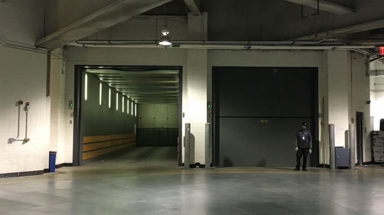 ” class=”wp-image-111419585″/>NBA and NHL players — in addition to VIPs and tour buses — arrive for games and practices via truck elevators. Each elevator is 80-feet long and can carry up to 80,000 pounds. That’s a lot of basketball players!