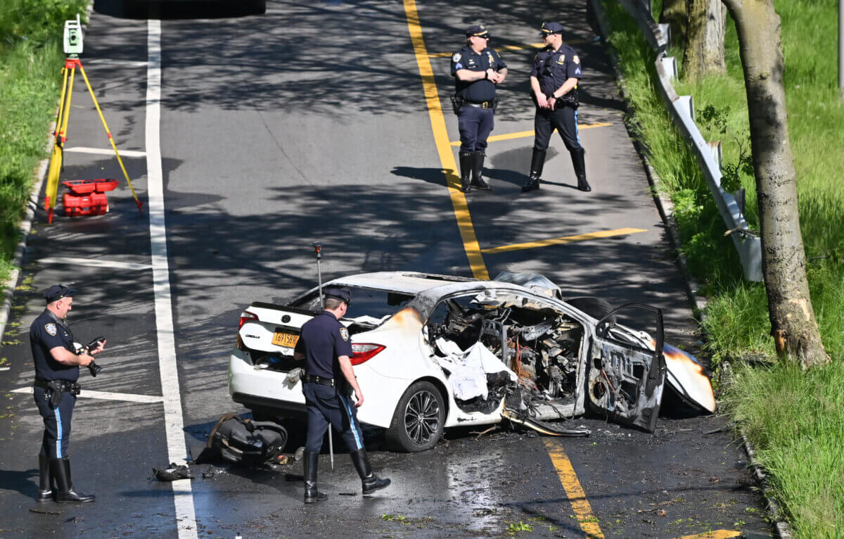 The crash took place at about 7:45 a.m. on Sunday on an access road to Exit 1 of the Belt Parkway, at Shore Road near 2nd Avenue. The car was driven into a tree and crashed with destructive force, mangling the automobile and engulfing it in flames.