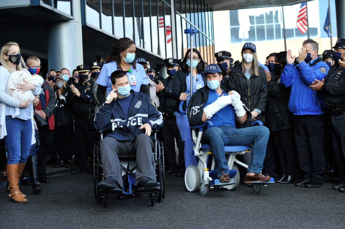 As nurses escorted them from the hospital, the two officers were met by their loved ones — and with thunderous applause from a large, masked crowd of their colleagues, including Police Commissioner Dermot Shea.