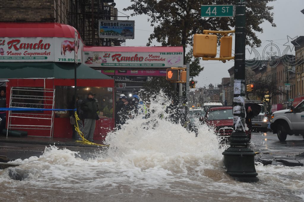 The water main erupted shortly after 5:30 a.m. on Nov. 24 at the northwest corner of Fifth Avenue and 44th Street in Sunset Park, shooting rocks, sidewalk concrete and asphalt int0 the air and sending trash cans rolling down the street. At times, the water was shooting up to five feet high.